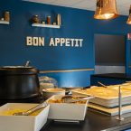 - Restauration variée en buffet, vin inclus : choix d’entrées, 3 à 4 plats chauds au choix selon saison (dont un végétarien), buffet de fromages et de desserts